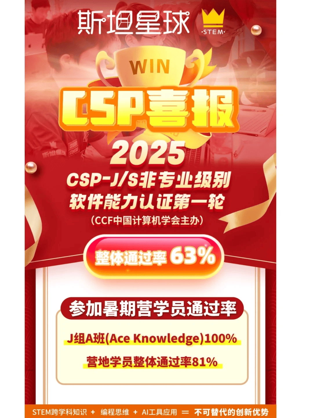 祝所有考生明日超常发挥,笔落题解,斩获佳绩!考后欢迎在评论区分享你的考后感受,咱们一起交流#斯坦星球科创编程 #信息学奥赛 #csp #csp复赛 #信奥备战干货 #信奥升学规划 #CSP全攻略