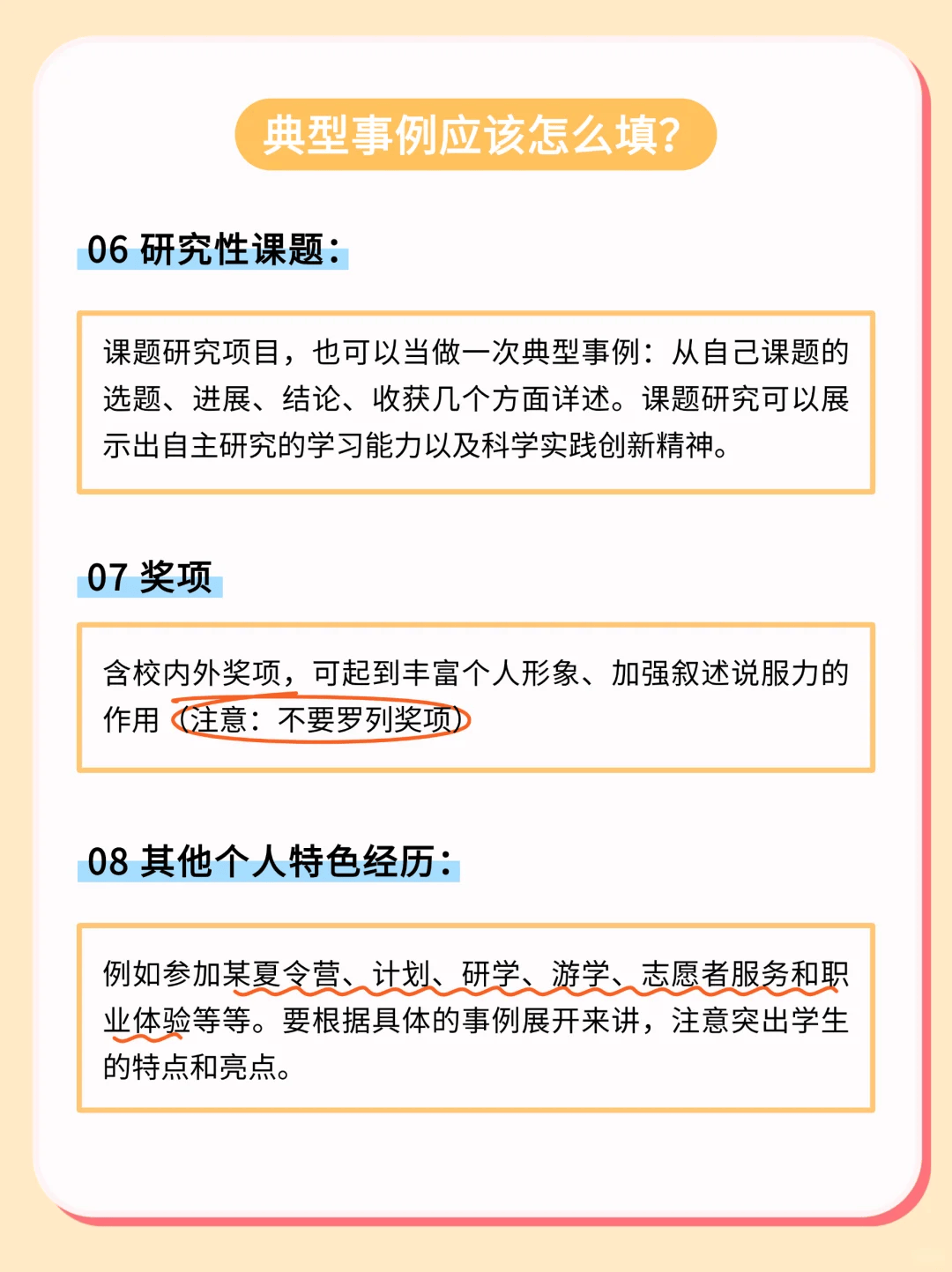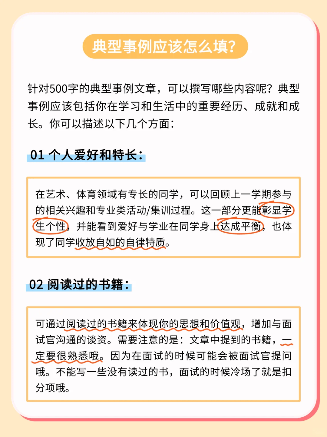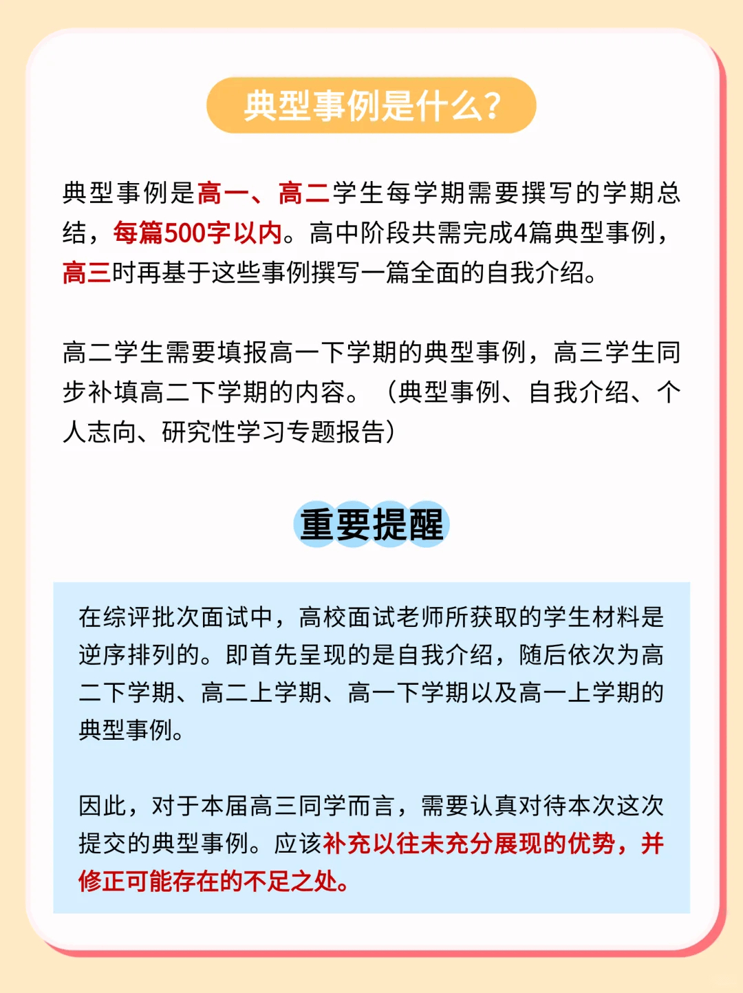 什么是典型事例?典型事例是高一、高二每学期需提交的学期总结,每篇 500 字以内。高中共需完成 4 篇,高三再基于这些内容撰写一篇全面的自我介绍。注意:高三同学提交的材料在面试时是逆序呈现的,所以每一次都要认真对待,查漏补缺!