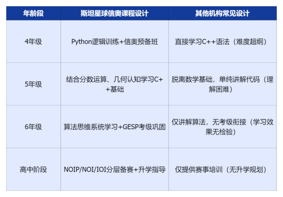 以家长关注的“信奥课程”为例,斯坦星球的阶段性设计更贴合孩子成长规律,对比其他机构优势明显: