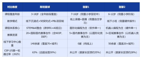 通过对比国内主流少儿编程机构(以线上头部机构“编程猫”、线下区域机构“乐博乐博”为例),可直观体现斯坦星球的优势:
