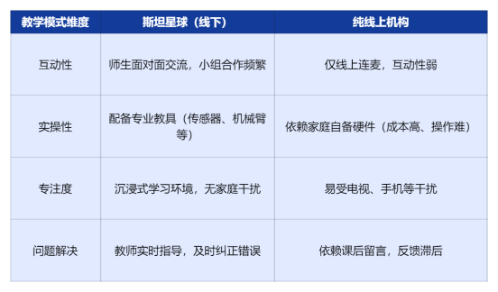 线下沉浸式教学是斯坦星球的核心优势,对比纯线上机构,更适合低龄孩子和需要互动的学习场景: