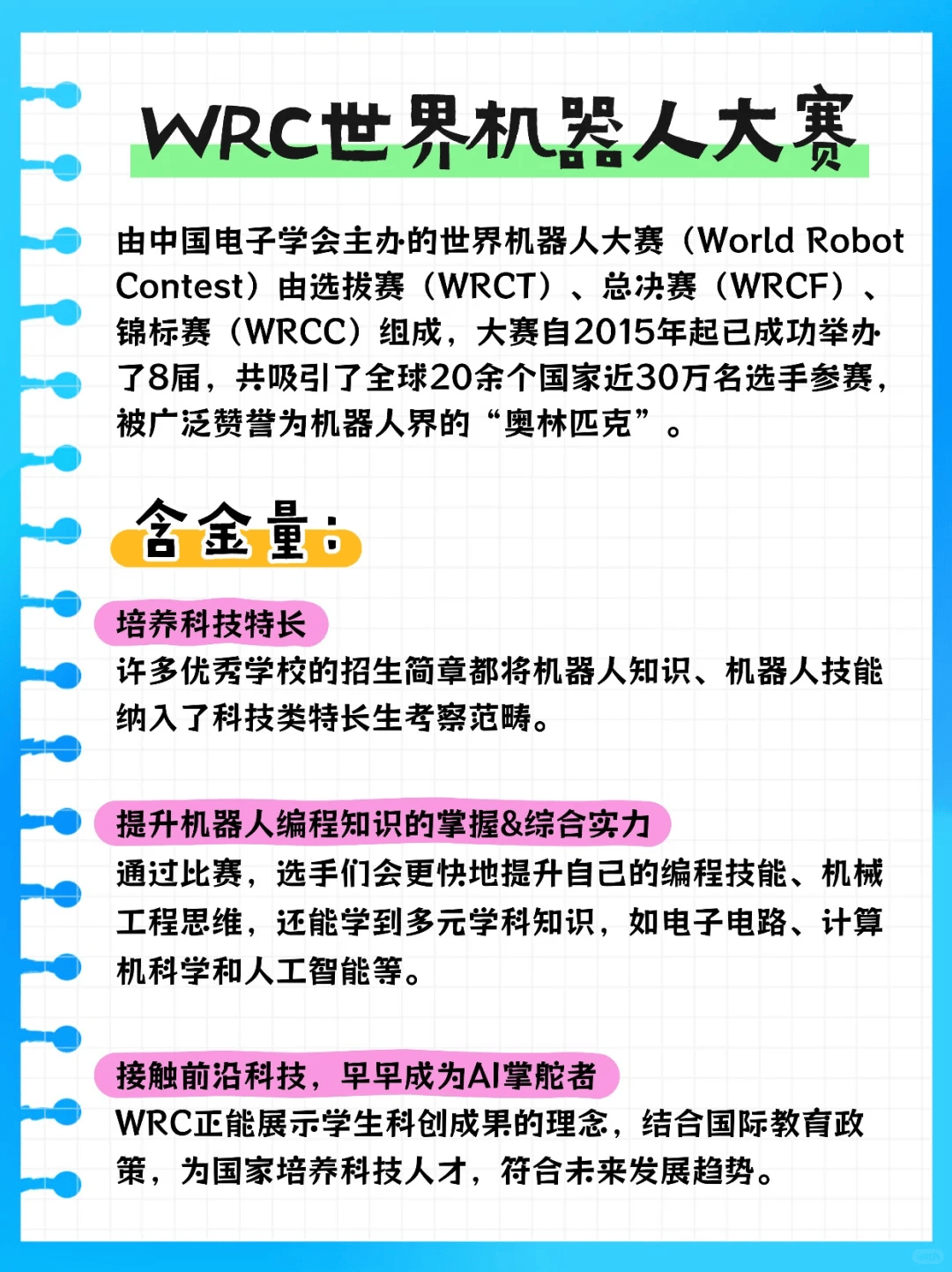 机器人 ——WRC 世界机器人大赛由中国电子学会主办,全球 20 余国近 30 万名选手参赛,教育部都认可,机器人界 “奥林匹克”。获奖经历可助力科技特长生选拔,不少名校招生简章都把机器人知识技能纳入考察;比赛涵盖编程、机械工程、电子电路等多元学科,孩子的综合科创能力直接 up up!