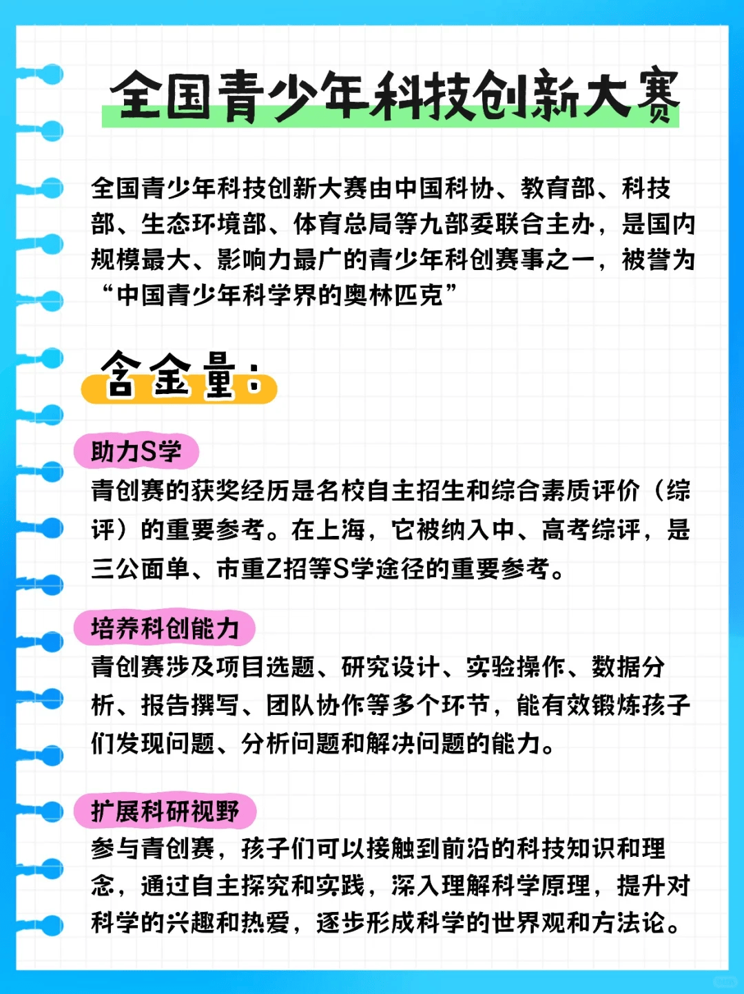科创 —— 全国青少年科技创新大赛科创领域 “天花板” 赛事,由中国科协、教育部等九部委联合主办。在上海,它是中高考综评、三公面单、市重 Z 招的重要参考;青创赛涉及项目选题、研究设计、实验操作、数据分析、报告撰写、团队协作等多个环节,能有效锻炼孩子们发现问题、分析问题和解决问题的能力。