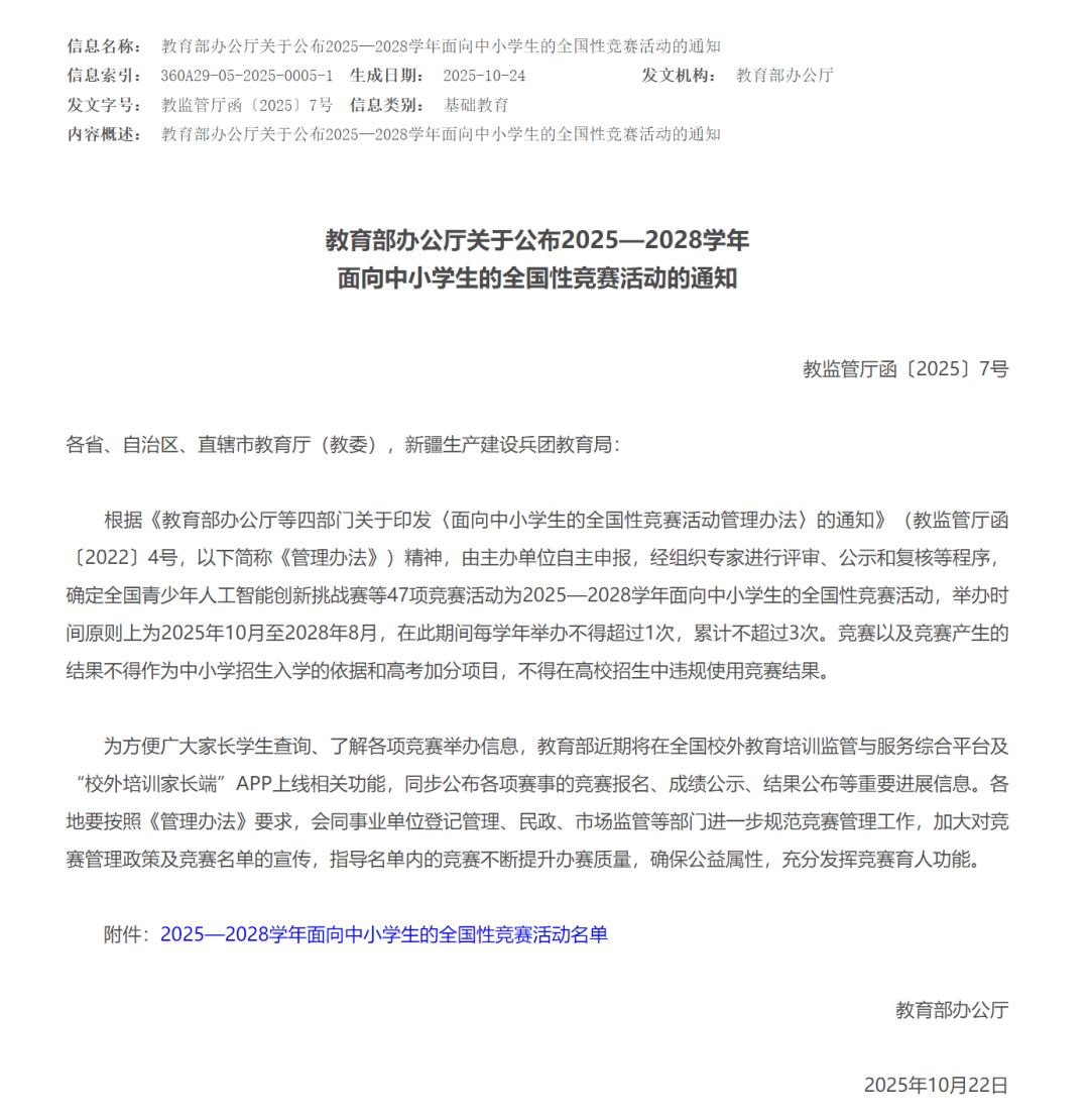 各位家长注意啦!教育部最新公布了2025-2028学年面向中小学生的全国性竞赛白名单,未来三年孩子能参加的正规赛事终于定了。