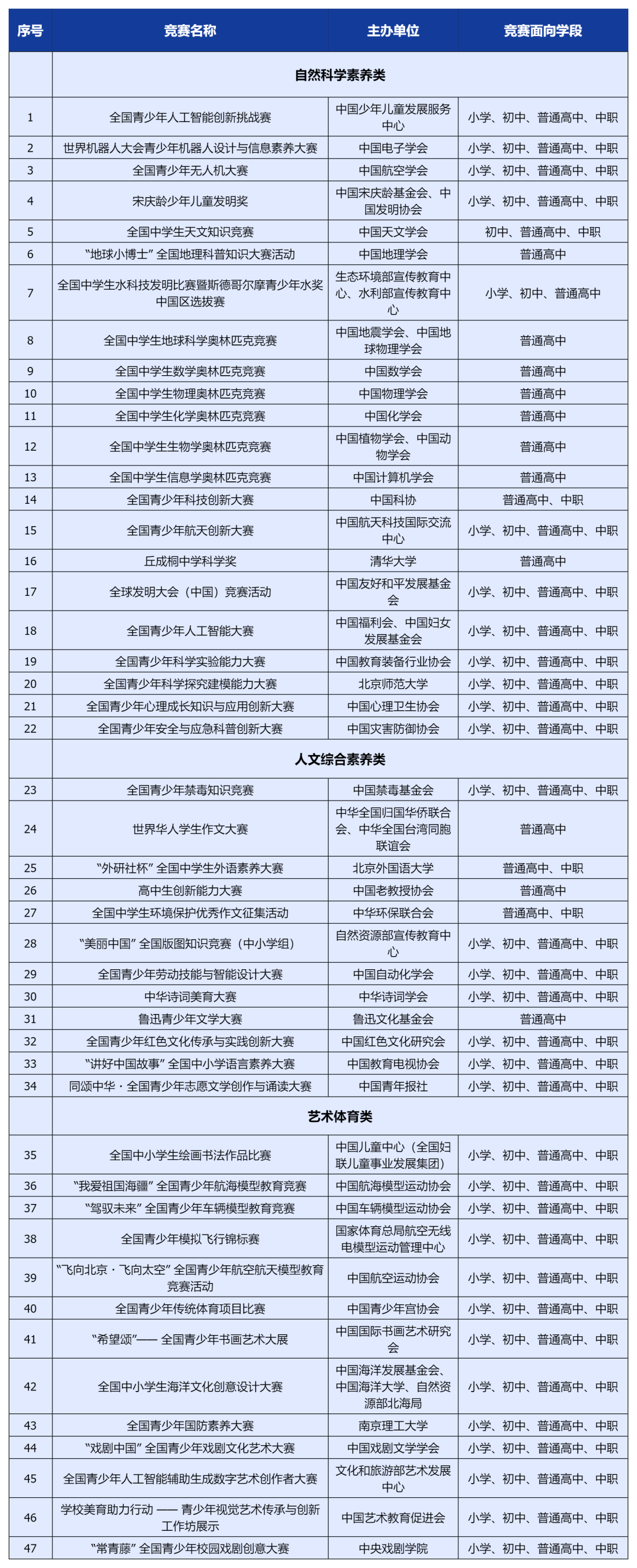 身心健康:首次加入“青少年心理成长知识与应用创新大赛”和“安全与应急科普创新大赛”,以后不仅要关注孩子的成绩,心理调节、安全防护能力也有正规赛事可以检验了。