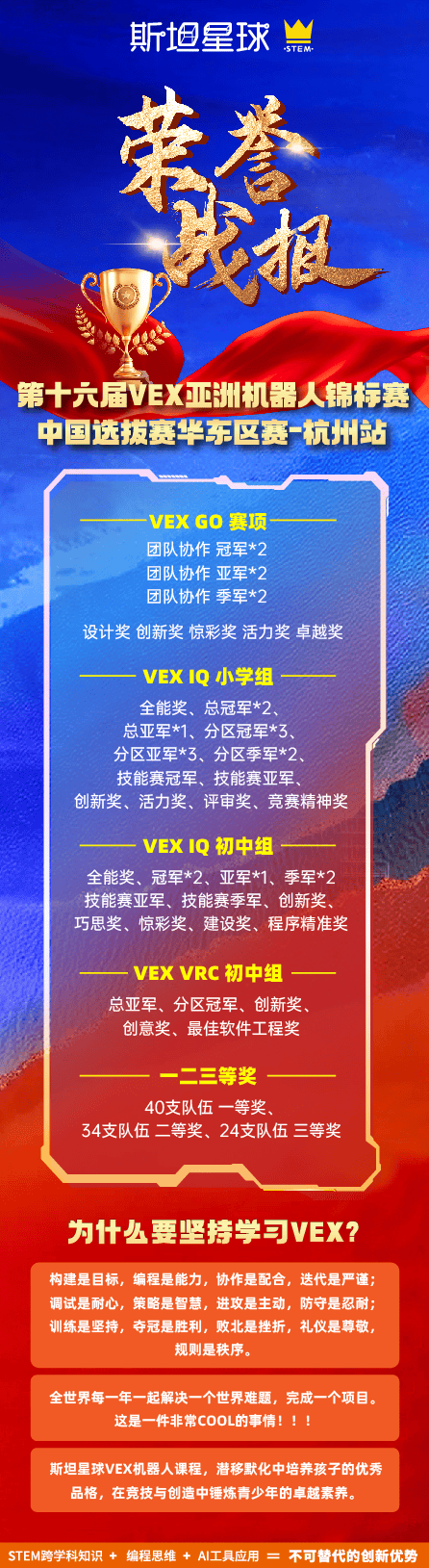 经过3天紧张激烈地角逐,最终斯坦星球学员勇夺VEX IQ小学组&初中组全能奖,包揽VEX GO赛项冠亚季军,斩获VEX IQ小学组总冠军&总亚军,以及VEX IQ初中组冠亚季军在内等140+项大奖。